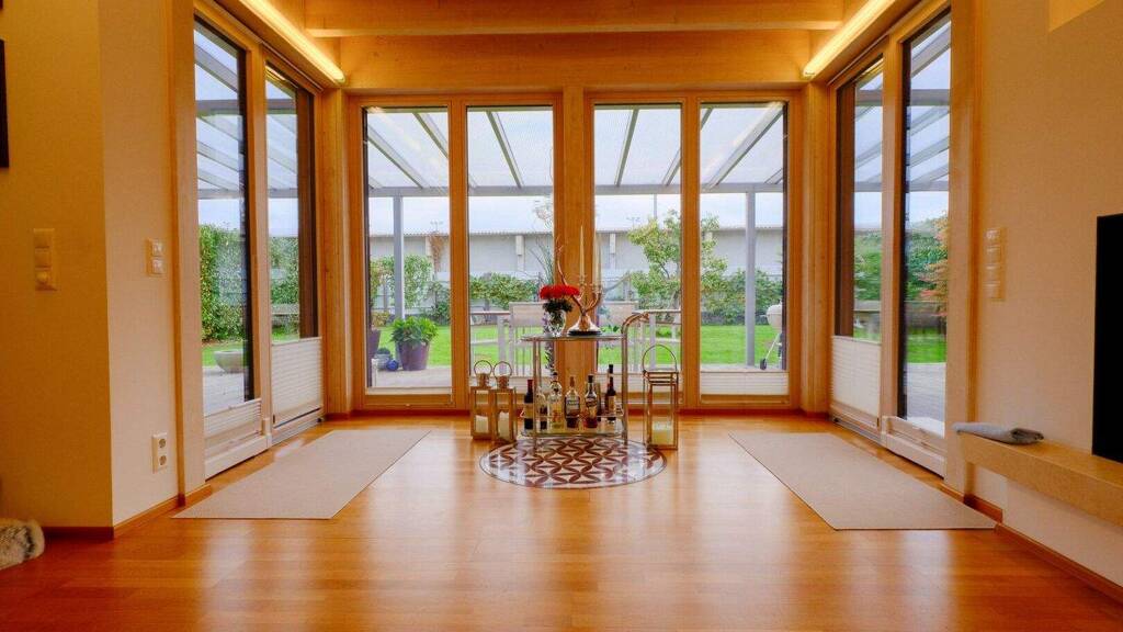 Die Innenausstattung ist ideal abgestimmt durch die Auswahl von großen hellen Fliesen in der Kombination mit einem Parkettboden aus Buche.