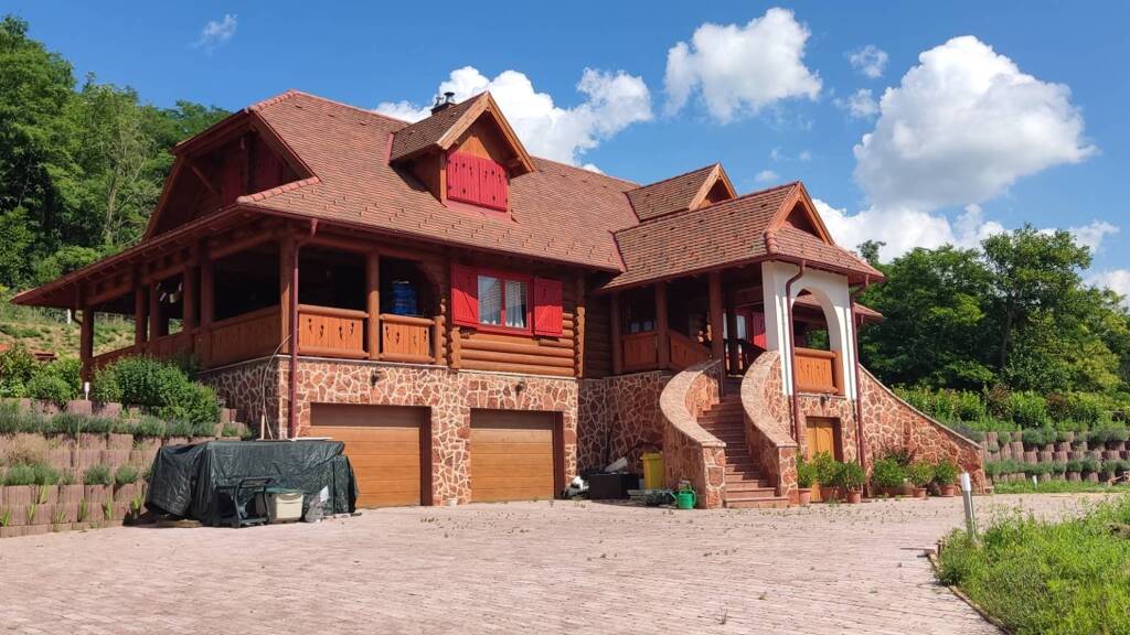 Dieses besondere, an Siebenbürgen erinnernde Naturstamm-Gebäude mit kräftiger Ausstrahlung befindet sich inmitten der Hügel von Somogybabod.