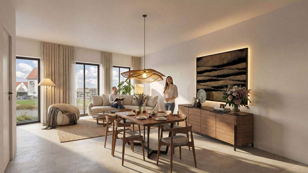Der offen gestaltete Wohn- und Essbereich bildet den Mittelpunkt der Wohnung. Große Fensterflächen sorgen für viel Tageslicht und schaffen eine helle, freundliche Atmosphäre. Die offene Küche fügt sich harmonisch in den Wohnbereich ein und bietet ausreichend Platz für einen modernen Koch- und Essbereich. Das Schlafzimmer ist gut proportioniert und bietet einen ruhigen Rückzugsort, während das moderne Badezimmer das stimmige Wohnkonzept abrundet.