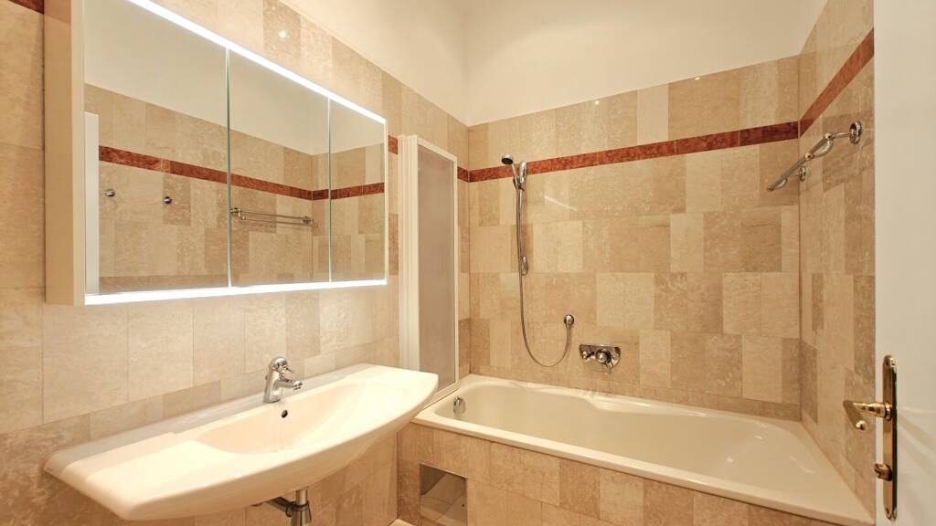 + Badezimmer mit Badewanne, Waschbecken samt Spiegelschrank und Marmorfliesen