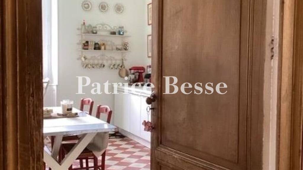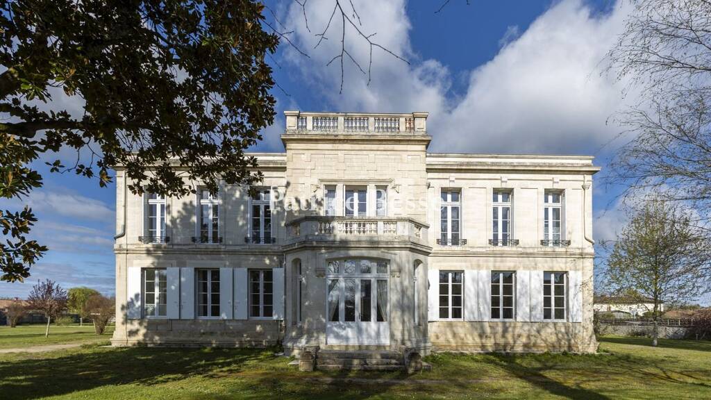 The main entrance leads into a long, wide dual-aspect hallway that connects to all the floor's rooms. Cement tiles cover the floor of this hallway, white Bordeaux limestone make up its walls and a plaster cornice embellishes its ceiling. Where you enter this central hallway, functional rooms flank it: a lavatory and a storeroom. After these, two bedrooms lie opposite one another. Each bedroom connects to a shower room and lavatory. Modern wallpaper adorns their walls, strip parquet covers their floors and a built-in marble fireplace in each room underlines the edifice's authenticity. Next come the living room and dining room, which also face one another. Two large wooden double doors form the entrance to each room. On the right is the living room. Old panelling covers the walls up to the top, a red marble fireplace stands majestically on one side and the floor is adorned with chevron parquet. A bay bathed in daylight leads onto a tiled terrace. This terrace offers a pleasant view of the grounds and its 200-year-old magnolia. The dining room is embellished with a white marble fireplace with projecting volutes. Its cast-iron radiators feature old flower patterns. The floor is tiled and the walls are adorned with wallpaper. A little further on stands a half-turn stone staircase with a guardrail made of metal and wood. A skylight fills it with daylight. The kitchen is fully equipped and modern. A scullery and storage space adjoin it. Through French windows, it leads directly out onto an outdoor tiled terrace near the swimming pool. It is a spacious kitchen. A checked pattern of red and white cement tiles covers its floor. Its walls and ceiling are painted white. Opposite it, ...
