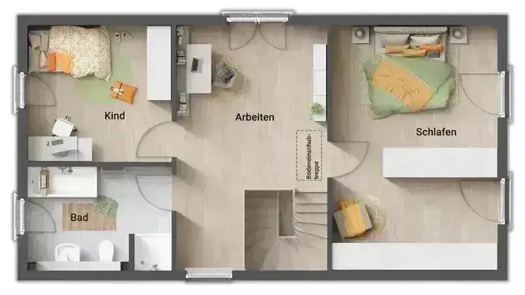 Die praktische Grundrissgestaltung macht das „Aura 125“ zu einem wahren Raumwunder, trotz der kompakten Baumaße. So kann zum Beispiel die Treppe im Haus einläufig geplant werden, sodass unterhalb Platz für einen Einbauschrank oder eine gemütliche Spielecke für die Kleinen entsteht. Während in den meisten Fluren nur unzureichend Stellmöglichkeiten für geräumige Schränke eingeplant ist, wird im Stadthaus Aura die Diele effizient genutzt und bietet somit ausreichend Stauraum für Jacken, Schuhe und Taschen. Ein praktisches Haus für seine Bewohner und Gäste.