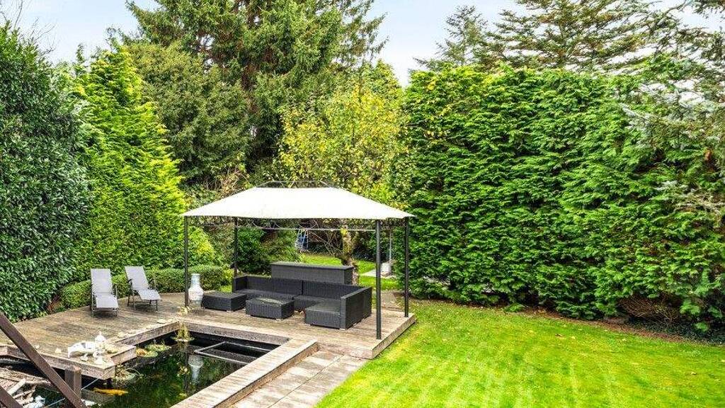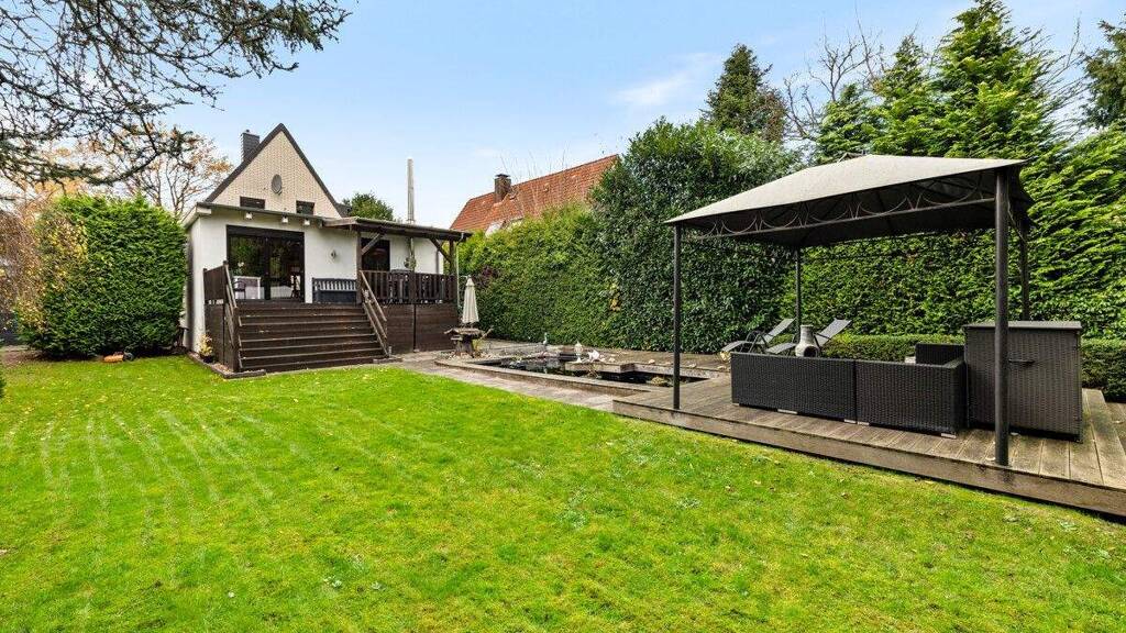 Dieses moderne Einfamilienhaus wurde im Jahr 2015 umfangreich saniert und durch einen großzügigen Anbau erweitert. Es befindet sich auf einem pflegeleicht angelegten ca. 1.000,00 m² großen Grundstück mit beheizbarem Schwimmteich. Sie betreten das Haus durch einen hellen Eingangsbereich. Von dort führen wenige Stufen ins Hochparterre. Von hieraus gelangen Sie in den großzügigen Wohnbereich mit Kamin und offener Küche. Die moderne Küche verfügt über einen praktischen Abstellraum und öffnet sich zum ca. 40,00 m² großen Wohnzimmer. Das lichtdurchflutete Wohnzimmer mit bodentiefen Terrassenfenstern befindet sich im Anbau von 2015. Die Statik des Anbaus ermöglicht zudem eine Aufstockung, wodurch in der zweiten Etage weitere ca. 40 m² Wohnfläche geschaffen werden könnten. Vom Wohnbereich gelangen Sie direkt auf die überdachte Holzterrasse mit Blick in den eingewachsenen Garten. Der beheizbare Schwimmteich und die Südwestterrasse sind die Highlights im Garten. Zur Straßenseite hin liegen zwei weitere Zimmer mit ca. 10,00 m² und 15,00 m². Diese waren ursprünglich miteinander verbunden und lassen sich bei Bedarf wieder zusammenführen. Darüber hinaus runden ein modernes Badezimmer mit Dusche sowie ein separates Gäste-WC das Erdgeschoss ab. Im zweiten Obergeschoss befinden sich ein Schlafzimmer mit abgetrennter Ankleidenische sowie ein modernes Badezimmer mit bodentiefer Dusche, Badewanne und Tageslichtfenster. Zusätzlich gehört ein weiteres Gäste-WC zur Etage. Die ans Haus angrenzende Doppelgarage bietet über 40,00 m² Nutzfläche.