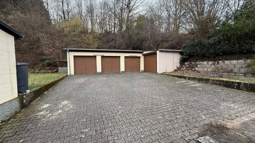 Eine Garage links vom Objekt und eine Einfahrt rechts vom Objekt mit 4 Garagen