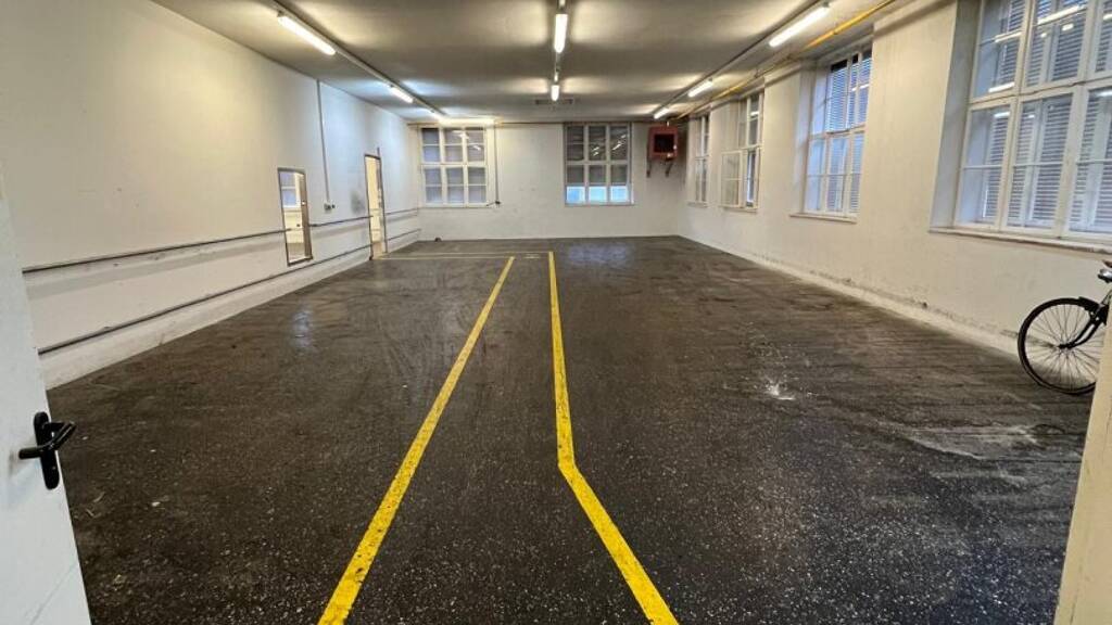 Die Halle befindet sich im 1. OG eines gewerblichen Gebäudes mit Auffahrtsrampe für LKW, Sattel oder Hängerzug.