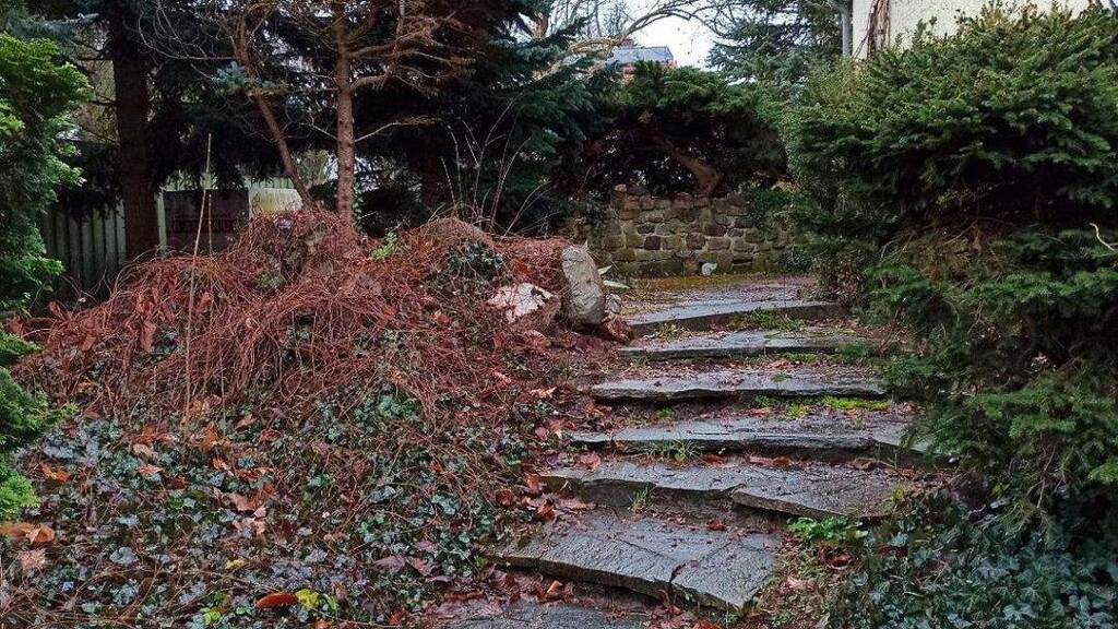 Großzügige Terrasse, die mit Naturstufen in den idyllischen Garten führt.