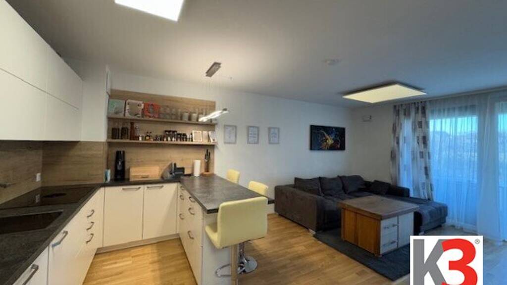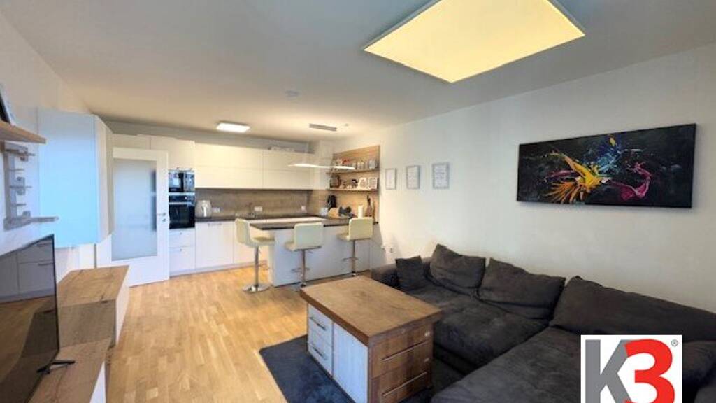 * Koch-/Essbereich - Die Küche mit ihren hellen Fronten und der dunklen Arbeitsplatte ist mit einem Bora-Induktionsherd, einem Backrohr, einem Kühl- sowie Tiefkühlschrank und einem Geschirrspüler ausgestattet. Zum Wohnbereich hin wurde an der Küchentheke, welche außerdem über weiteren Stauraum verfügt, der schöne Essplatz mit Hockern eingerichtet.