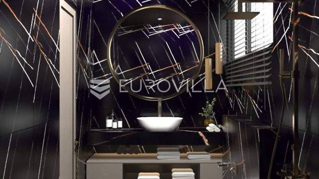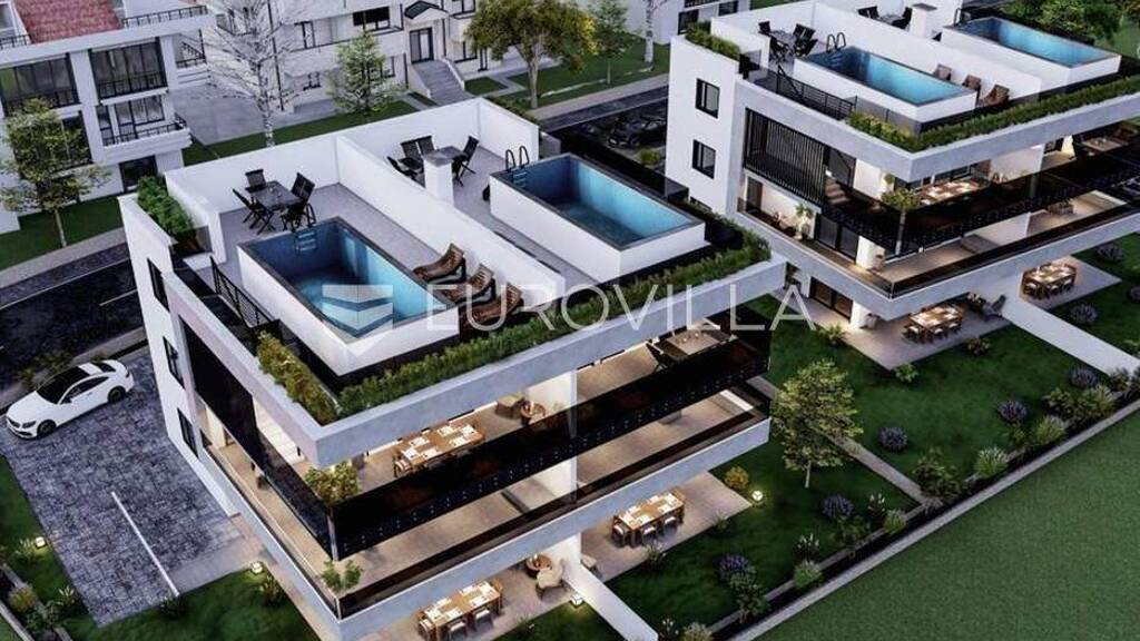 Otok Krk, Grad Krk, luksuzan troetazni stan s bazenom NKP 192m2 smjesten u urbanoj villi na tri etaze. Prva etaza se sastoji od hodnika, tri spavace sobe s izlazom na terasu, kupaonice i toaleta. Na drugoj etazi nalazi se prostrani dnevni boravak, s kuhinjom, blagavaonicom, toaletom i izlazom na terasu s pogledom na more. Treca etaza sastoji se od privatnog krovnog bazena sa suncalistem i vanjskom kuhinjom. Stanu takoder pripadaju i dva parkirna mjesta.