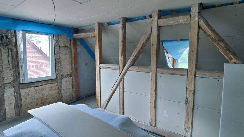 Das Mehrfamilienhaus mit zwei sanierten Wohneinheiten im Erdgeschoss und erstem Obergeschoss, verfügt darüber hinaus über eine dritte Wohnung im Dachgeschoss, deren Ausbau bereits begonnen hat und bis zum Verkauf ruhend gestellt wird. Hierbei erfolgten bereits die Rohinstallationen für Heizung, Wasser, Abwasser und Strom, ein teilweiser Innenausbau mit Vorsatzschalung der Decken und Außenwände inklusive innenliegender Dämmung sowie der Einbau mehrerer neuer Kunststofffenster mit elektrischen Rolläden. Durch Fortführung des Innenausbaus, könnte somit zeitnah eine dritte Wohneinheit mit teilweise freiliegendem Fachwerk und einem straßenseitigen Balkon auf dem Erkeranbau, zur Vermietung oder Eigennutzung zur Verfügung stehen. Ein Geländer für den künftigen Balkon wurde ebenfalls bereits angebracht und Baumaterialien für den weiteren Ausbau liegen im Dachgeschoss ebenso noch bereit. Aufgrund der bereits getätigten Vorarbeiten und den vorliegenden Baumaterialien, wäre der zeitliche sowie finanzielle Aufwand zur Fertigstellung der Dachgeschosswohnung überschaubar und durch zusätzliche Mieteinnahmen von ca. 5.500,00 € p.a., binnen weniger Jahre refinanziert... (Nähere Informationen erhalten Interessenten im Expose) Raumaufteilung:
