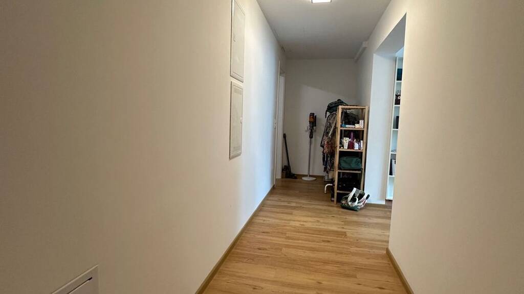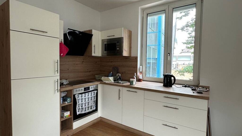 Der offene Wohn- und Küchenbereich ist mit einer hochwertigen Einbauküche ausgestattet, die keine Wünsche offenlässt. Die vollständig installierten Deckenleuchten sorgen für eine angenehme Beleuchtung, während der offene Schlafbereich flexible Gestaltungsmöglichkeiten bietet. Der großzügige Flur und Eingangsbereich schaffen eine einladende Atmosphäre.