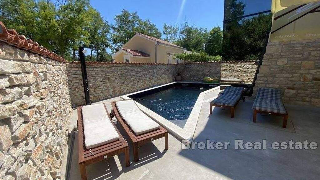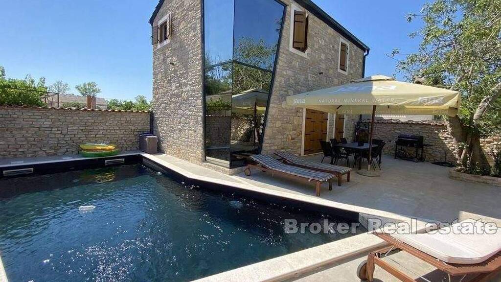 Das Anwesen ist aus renommierten Materialien wie Stein aus der Kaserne von 1905 gebaut, der mit reflektierendem Glas kombiniert wird, das den Innenraum verbirgt. Bei der Dekoration des Innen- und Außenbereichs des Hauses wurden Materialien von außergewöhnlicher Qualität verwendet. Die Türen und Fenster sind aus sibirischer Kiefer, für den Türrahmen wurde echter weißer Stein verwendet, der zur Isolierung und der Wandstärke von 54 cm beitrug, während für die Innentreppe massive Eiche verwendet wurde. Das Haus mit einer Gesamtwohnfläche von 102m2 besteht aus einer Küche, einem Esszimmer, zwei Schlafzimmern und zwei Badezimmern. Das Anwesen ist mit einer mechanischen Fußbodenheizung mit zusätzlichen 3 Klimaanlagen ausgestattet. Das Haus verfügt über einen 23 m großen Swimmingpool mit dunkler Oberfläche für zusätzlichen Effekt und eine regulierbare Wärmepumpe.