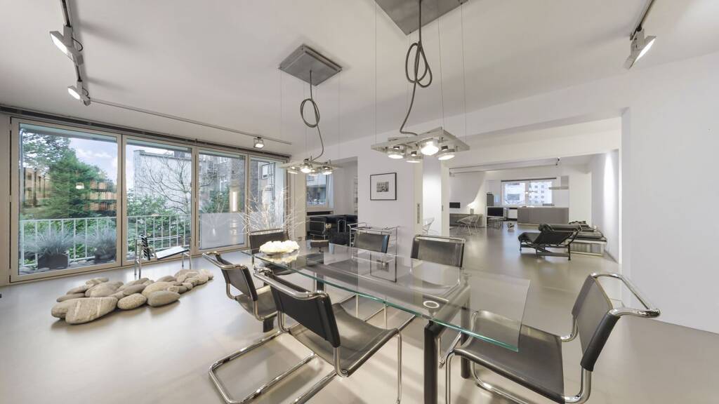 Durch die rechte Wohnungstür betreten Sie den Eingangsbereich dieser außergewöhnlichen Wohnung. Hier folgt ein Highlight auf das nächste: Der helle, offen gestaltete Wohn- und Essbereich beeindruckt durch Großzügigkeit und Stil. Die hochwertige Einbauküche von bulthaup ist bestens ausgestattet und bietet ideale Voraussetzungen, um Gäste auf höchstem Niveau zu bewirten. Ein angrenzender Hauswirtschaftsraum sorgt für zusätzlichen Stauraum. Vom Essbereich aus gelangen Sie auf die Loggia. Ein Flur mit beidseitig integrierten Ankleidebereichen führt weiter in das großzügige Masterbad. Ausgestattet mit Badewanne, bodengleicher Dusche, Doppelwaschtischanlage sowie einem separaten WC mit Bidet erfüllt es höchste Ansprüche.