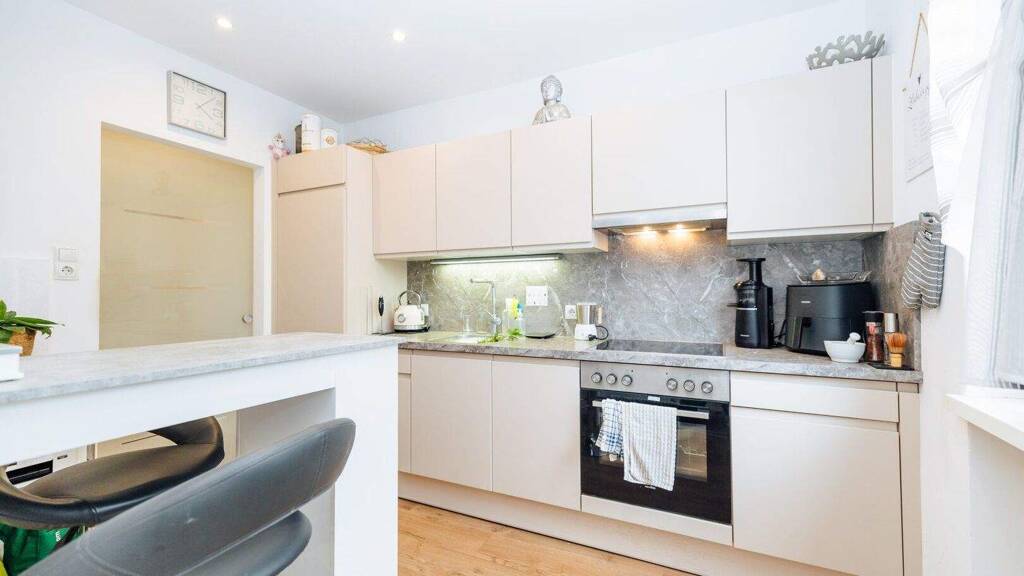 Von hier aus gelangen Sie durch eine schicke Glasschiebetür in die neuwertige, voll ausgestattete Küche. Diese bietet Ihnen alles, was Sie für kulinarische Meisterwerke benötigen - inklusive Kühlschrank, Gefrierschrank, Geschirrspüler, Cerankochfeld und Backofen. Die hochwertigen Decken-Einbauspots sorgen für optimale Beleuchtung, und das große Fenster lässt tagsüber viel Sonnenlicht herein.