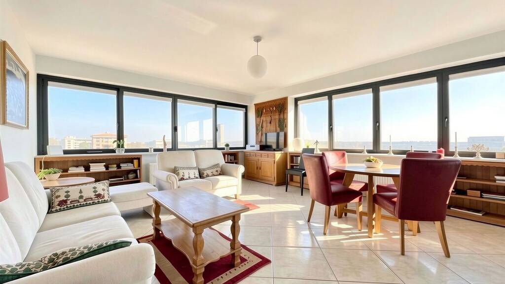 Das geräumige, mit Mosaikfliesen geschmückte Entrée eröffnet den Zugang zum großzügigen, offenen Wohn- und Essbereich. Dort erwartet Sie ein lichtdurchflutetes Ambiente mit umlaufenden Fenstern, die Ihnen einen wundervollen, unverbaubaren Panoramablick über die Dächer des Hamburger Zentrums bis zur Elbphilharmonie bieten.