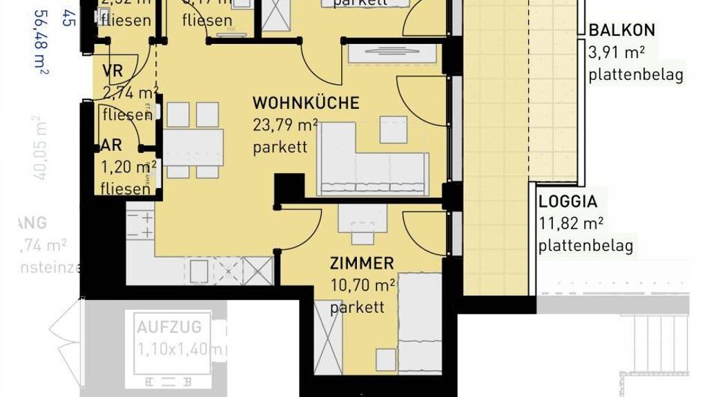 Sollten Sie mehr Platz benötigen, planen wir auch gerne eine größere Wohnung (zB eine 4-Zimmer-Wohnung anstelle von zwei nebeneinander liegenden 2-Zimmer-Wohnungen) für Sie. Fragen Sie einfach bei unserem Vertrieb nach!
