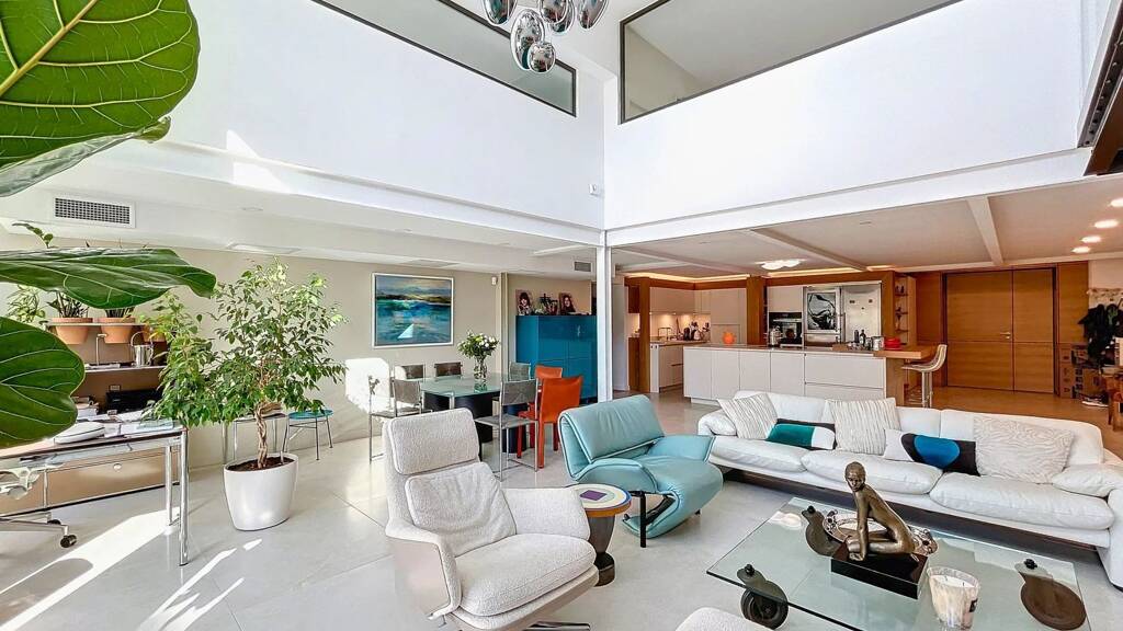 The entrance features a spacious walk-in wardrobe serving as a cloakroom before opening onto a large living area. The living room benefits from high ceilings and plenty of natural light thanks to large bay windows opening onto a spacious terrace with space for a pond. A sleek, open-plan kitchen blends seamlessly into the overall design.