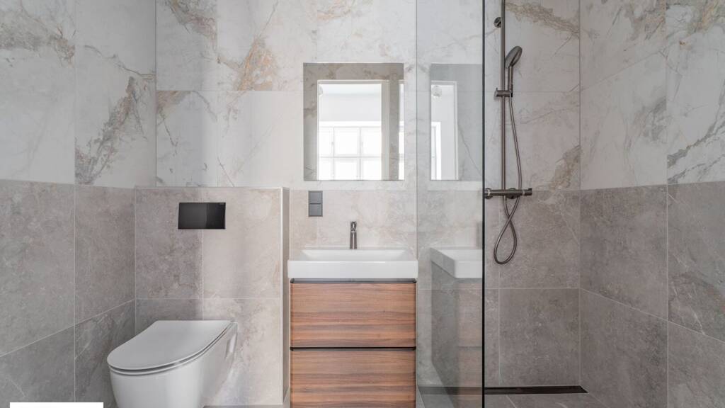 * Zweites Badezimmer mit bodenebener Dusche und Waschtisch