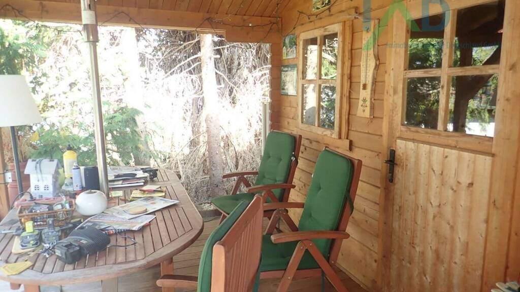 Es ist mit einer gut ausgestatteten Gartenlaube und einer Doppelgarage bebaut. Die Doppelgarage kann bei Bedarf abgerissen werden, um die Fläche anderweitig zu nutzen.