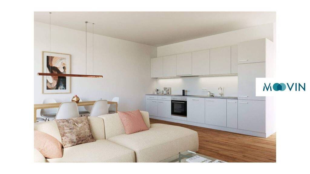 Mittelpunkt des modernen Mietobjekts ist das offen gestaltete Wohn- und Esszimmer. Große, bodentiefe Fenster erfüllen den Wohnraum mit viel Helligkeit und schaffen einen lichtdurchfluteten Raum zum Relaxen, Kochen und Beisammensein. An einer Wandseite des Zimmers wurde eine schicke platingraue Einbauküche mit allen notwendigen Elektronikgeräten in den Raum integriert. Für angenehme Stunden im Freien erreichen Sie vom Wohnbereich aus einen der zwei Balkone des Apartments. Der zweite grenzt an das Schlafzimmer. Mit ihrem farbenfrohen Farbanstrich sind die beiden Outdoorbereiche nicht nur optisch ein Highlight, sondern bieten auch eine wundervolle Aussicht auf die begrünten Innenhöfe des Quartiers.