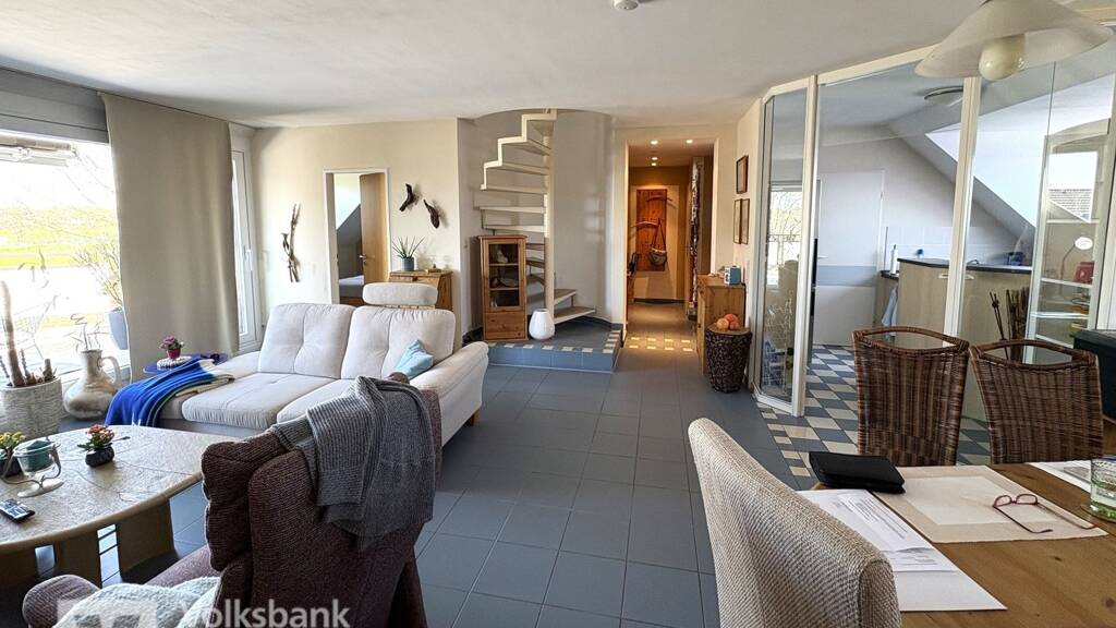 Zurück in der Diele gelangen Sie in das großzügige Wohn- und Esszimmer mit Ausgang zum plattierten Balkon, Zugang zum gefliesten Schlafzimmer, Aufgang in den Maisonette-Bereich über eine mit Holz ausgelegte Stahltreppe sowie dem Zugang zum offen gestalteten Küchenbereich, der nur durch eine Glasfront abgeteilt ist. Über die Ost-West-Ausrichtung des Wohn-und Esszimmers sowie des Balkons genießen Sie den ganzen Tag eine optimale Auslichtung und können den Feierabend auf dem Balkon genießen.