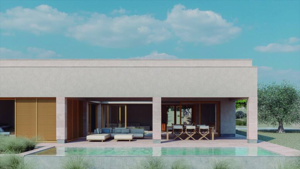 Dieses einst?ckige Villenprojekt verf?gt ?ber eine beeindruckende Fl?che von ca. 286 m? und einen Pool. Es ist so konzipiert, dass es drei Doppelschlafzimmer, zwei Badezimmer, eine ger?umige, moderne K?che mit Essbereich, ein gro?es Wohnzimmer und einen reizvollen Innenhof mit gro?en Fenstern umfasst, die f?r viel nat?rliches Licht im gesamten Haus sorgen.