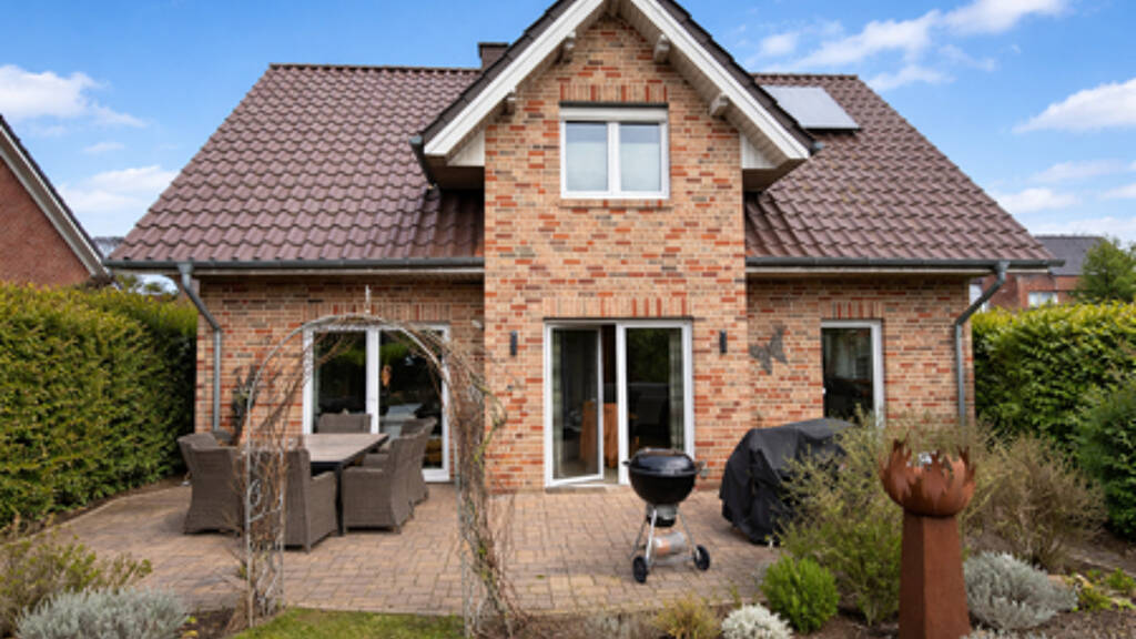 Bereits beim Betreten des Hauses überzeugt die klare und funktionale Grundrissgestaltung. Die einladende Diele erschließt ein separates Arbeitszimmer, das sich hervorragend als Homeoffice oder Gästezimmer eignet, ein modernes Gäste-WC sowie einen praktischen Hauswirtschaftsraum. Der großzügige Wohn- und Essbereich bildet das Herzstück des Hauses. Große Fensterflächen sorgen für eine helle, freundliche Atmosphäre und schaffen eine harmonische Verbindung zwischen Innen- und Außenbereich. Von hier aus gelangen Sie direkt auf die Terrasse und in den gepflegten Garten. Die angrenzende Küche fügt sich funktional in das Raumkonzept ein und bietet kurze Wege sowie ausreichend Platz für den Alltag.