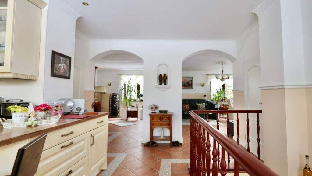 Die obere Ebene umfasst einen Eingangsbereich; ein Gäste-WC; eine offen gestaltete Küche, ausgestattet mit einer modernen, hellen Einbauküche; zwei Zimmer sowie einen großzügigen Wohn-/Essbereich mit Kamin - das Herzstück des Hauses. Vom Küchenbereich ist die ca. 52 m² große Terrasse zugänglich, und eine elektrische Pergola sorgt in den warmen Monaten für Schatten. Die untere Ebene besteht aus einem Flur; zwei Schlafzimmern sowie einem sehr geräumigen Badezimmer, ausgestattet mit einer Eckbadewanne, einer großen, bodentiefen Dusche sowie Handtuchwärmer. Auf dieser Ebene befinden sich zudem eine gemeinschaftlich mit der oberen Wohnung genutzte Waschküche sowie die im Jahr 2021 erneuerte Gastherme.