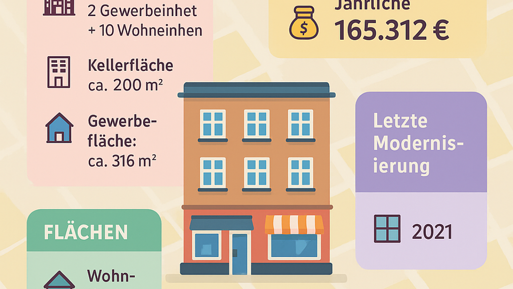 Gesamtfläche: 1.070,00 m², Anzahl Balkone: 1, Anzahl der Wohneinheiten: 10, Anzahl der Gewerbeeinheiten: 2, Bundesland: Nordrhein-Westfalen, 5 Etagen, modernisiert: 2022, Distanz zum Flughafen: 10.49, Distanz zum Hauptbahnhof: 1.67, Distanz zum Bus: 0.16