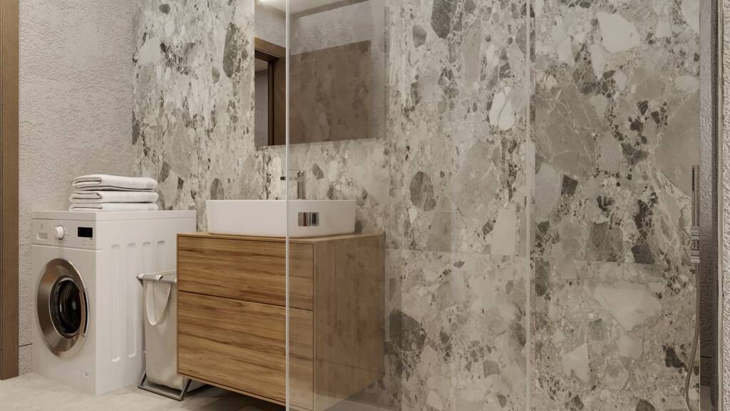 Zwei Schlafzimmer, ein stilvoll ausgestattetes Tageslichtbad mit bodengleicher Dusche sowie ein separates Gäste-WC bieten Komfort und Funktionalität. Ein praktischer Abstellraum ergänzt das Wohnangebot und sorgt für Ordnung im Alltag.