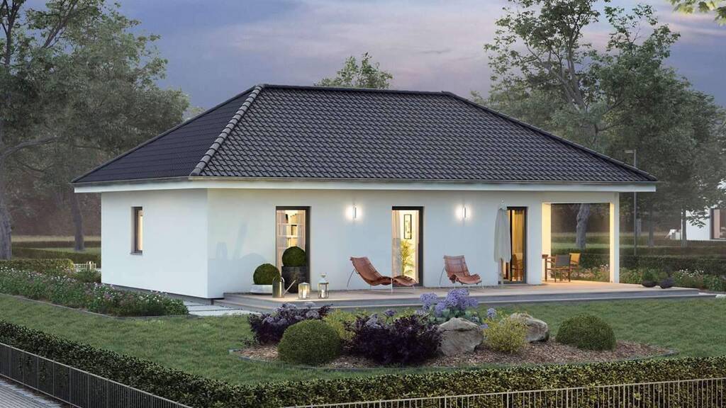 Der attraktive Walmdach-Bungalow bietet ideenreichen Baufamilien auf 108 m² viele Möglichkeiten, die eigenen Vorstellungen umzusetzen. Ein echtes Highlight: Die überdachte Terrasse mit direktem Zugang aus dem großzügigen Wohn-, Ess- und Küchenbereich, die an schönen Tagen den Wohnraum ins Freie hinaus verlängert. Daneben erhöhen das geräumige Bad und viele intelligent integrierte Stellflächen oder Stauräume den individuellen Wohnkomfort. Nicht zuletzt überzeugt das ComfortStyle 10.02 W mit einer klaren, geradlinigen Architektursprache.