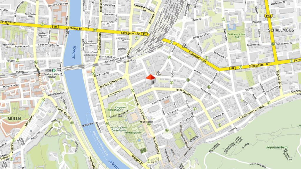 Die Faberstraße 17 in Salzburg ist verkehrsgünstig gelegen und gut an das öffentliche Verkehrsnetz der Stadt angebunden. In unmittelbarer Nähe der Adresse befinden sich mehrere Bushaltestellen, die von verschiedenen Buslinien bedient werden.