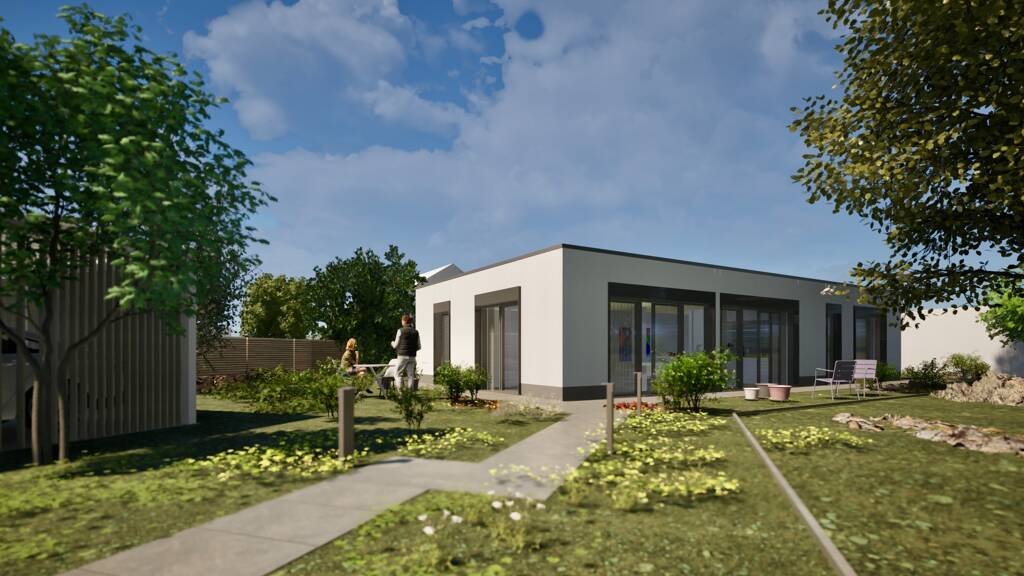 Ein Bungalow, ein Haus mit zwei Vollgeschossen, ein 1,5-geschossiges Haus, ein Haus mit separater Wohnung, z. B. fĂĽr eine Pflegekraft: unten eine komplette Ebene, oben eine halbe Ebene, kombiniert mit einer groĂźzĂĽgigen Terrasse.