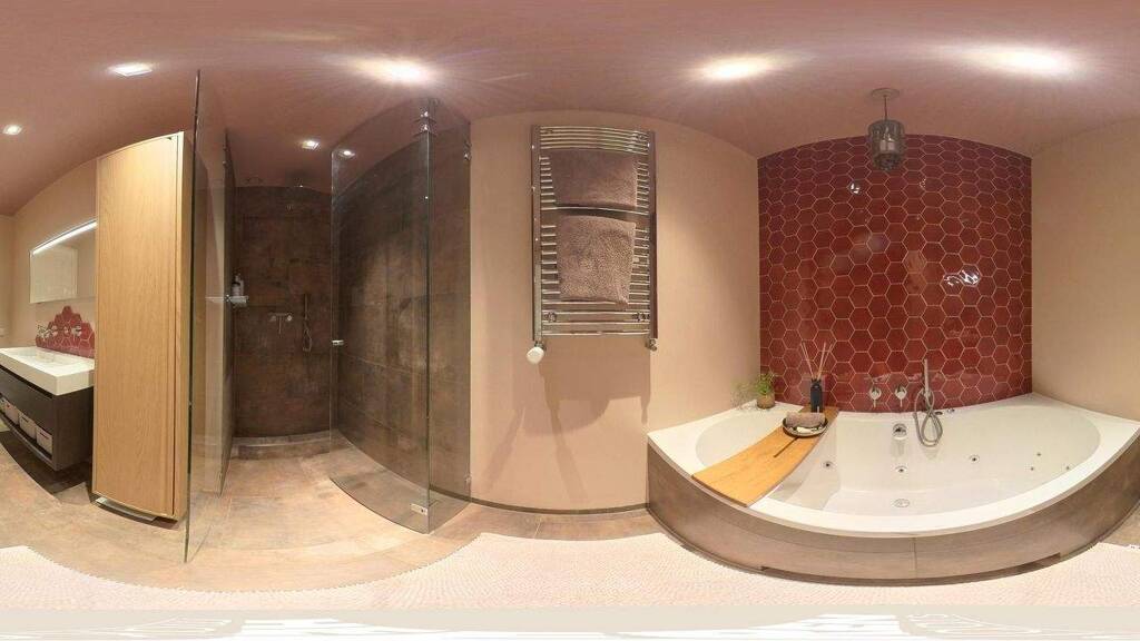 the bathroom is stylishly designed in warm brown shades with a striking red hexagon tile accent. it features a whirlpool bathtub, a separate walk-in rain shower, a vanity unit with ample storage drawers, a wall cabinet, a designer radiator, and underfloor heating. a wonderful place to unwind.