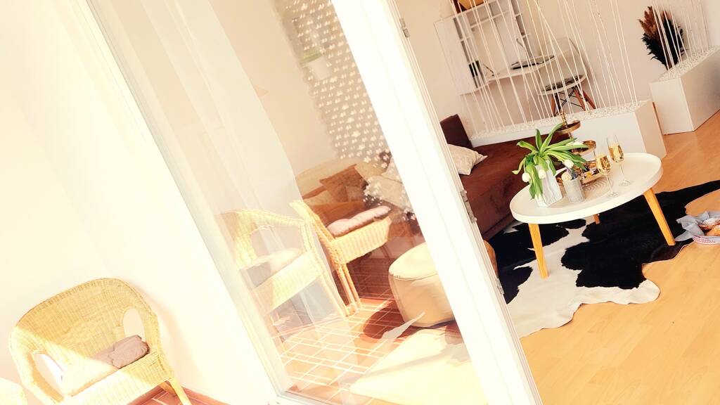 Ein heller, geräumige Flur führt in alle Wohnräume. Das Wohnzimmer lädt im freundlichen und modernen Vintage-Ambiente zum Verweilen ein. Auf der mit vielen verschiedenen Kissen bestückten Couch kannst du z.B. nach deinem Arbeitsalltag die Füße hochlegen und deine Sachen auf dem runden, einladenden Wohnzimmertisch abstellen. Oder du kannst ruhige Minuten auf den Sitzsäcken verbringen. Der quadratische, simple Eßtisch ist ausklappbar. Ebenso der mit weißem Bambus abgetrennte Arbeitsbereich, solltest du auch Homeoffice planen.