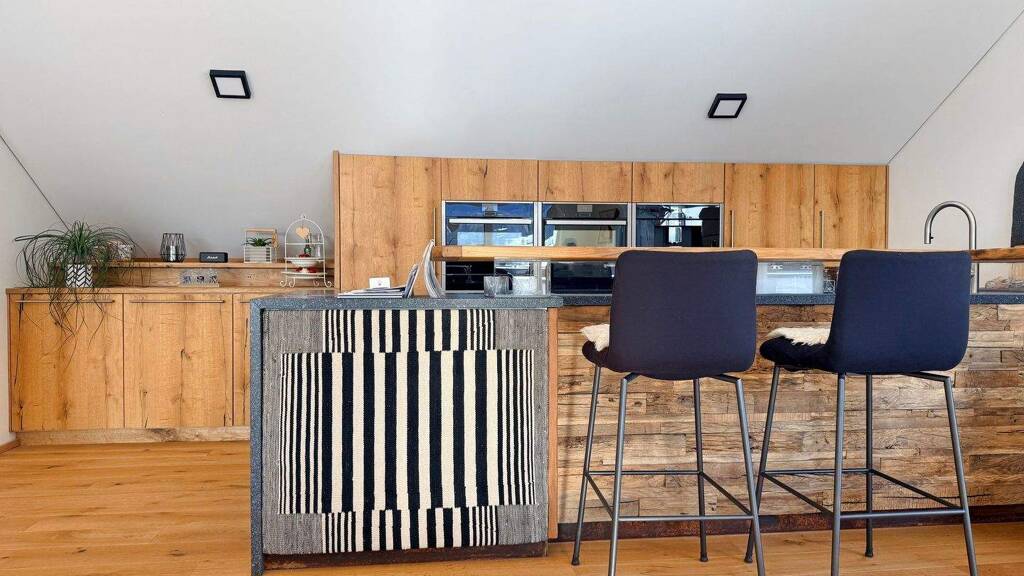 Die stilvolle Altholz-Einbauküche mit Kochinsel und integrierter Bar fügt sich harmonisch in den Wohnbereich ein und wird durch eine Speis ergänzt. Zur Wohnung gehören außerdem zwei Tiefgaragenstellplätze sowie ein Kellerabteil, die beide bequem mit dem Lift erreichbar sind. Besonders hervorzuheben sind die Raumhöhen von über 4 m sowie die Beheizung mittels Zentral-Fußbodenheizung, die in allen Räumen für ein angenehmes Wohnklima sorgt.