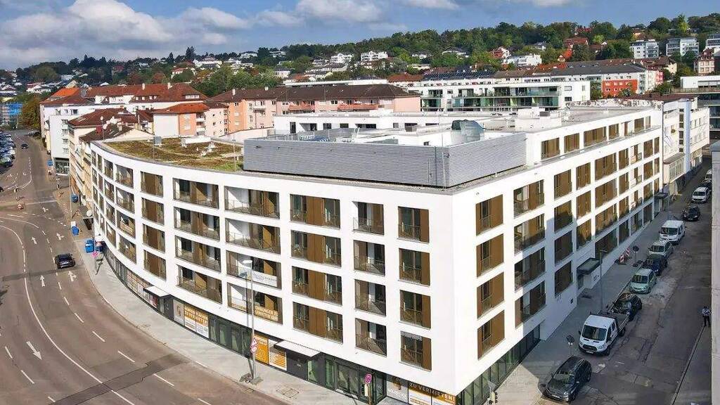 Das im Jahr 2023 errichtete Wohn- und Geschäftshaus im KfW55-Standard mit fünf Gewerbeeinheiten verfügt über insgesamt 5-6 Geschosse.