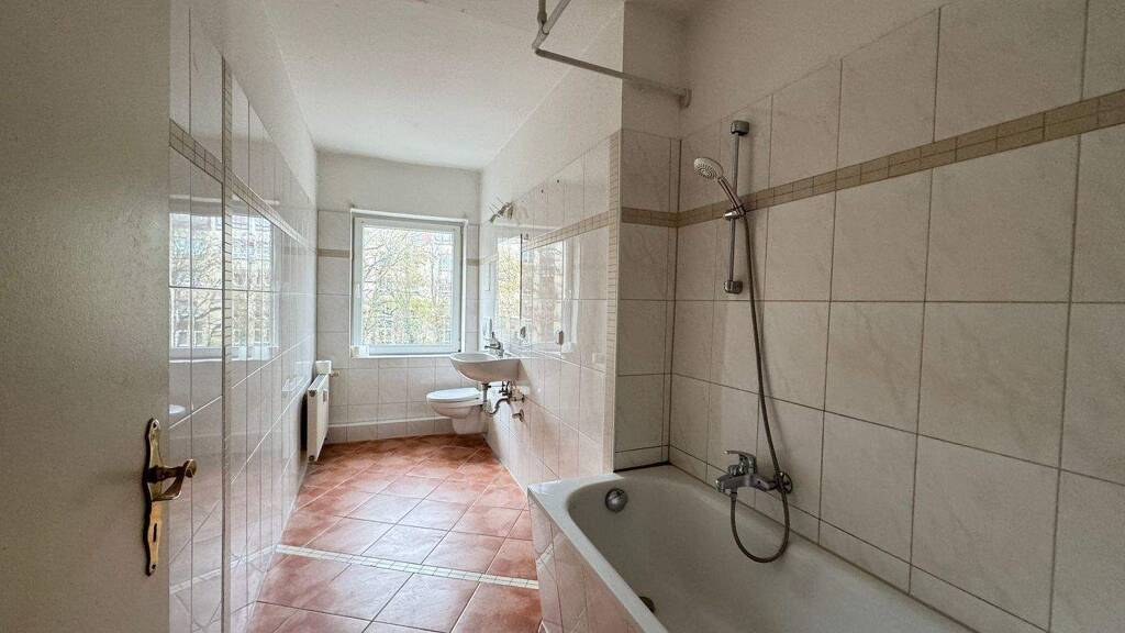 Beim betreten der Wohnung gelangt man zur Rechten in das Schlafzimmer. Nebenan befindet sich das tagesbelichtete Wannenbad. Grade zu ist der offene Wohn- und Küchenbereich mit einer Einbauküche.