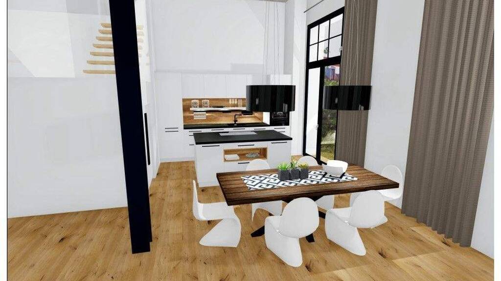 Die Küche ist als eigenständiger Bereich geplant und liegt angenehm nah am Essbereich. Herzstück des Hauses ist der großzügige Wohn-/Essbereich mit guter Aufteilung für Esstisch und Wohnzone. Von hier aus führt der direkte Zugang auf die Terrasse, wodurch sich der Wohnraum in der warmen Jahreszeit ideal nach außen erweitert.
