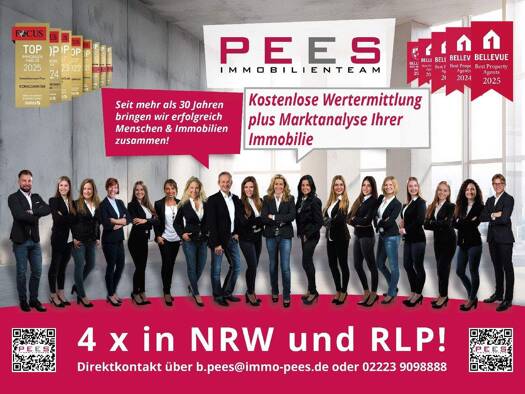 Seit mehr als 30 Jahren ist Birgit Pees-Neunkirchen in der Immobilienbranche tätig. 1994 gründete sie das Immobilienteam Pees, das heute mit seinen vier Büros in NRW und RLP - 53639 Königswinter-Ittenbach, 53567 Asbach, 56593 Horhausen und 56593 Huf für viele Kunden in der gesamten Region tätig ist. Das Gebiet erstreckt sich vom vorderen Westerwald über den Rhein-Sieg-Kreis bis nach Köln/Bonn. Hierdurch decken wir einen großen Einzugsbereich/Interessentenkreis ab, der auch unseren Verkäufern zugute kommt. Siehe hierzu auch auf unserer Website den Button „Referenzen“.