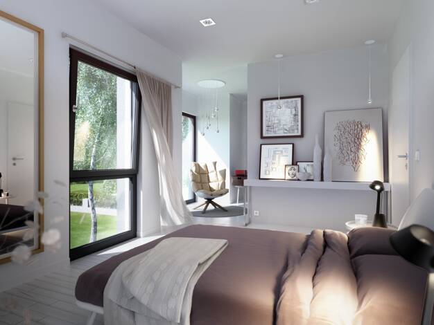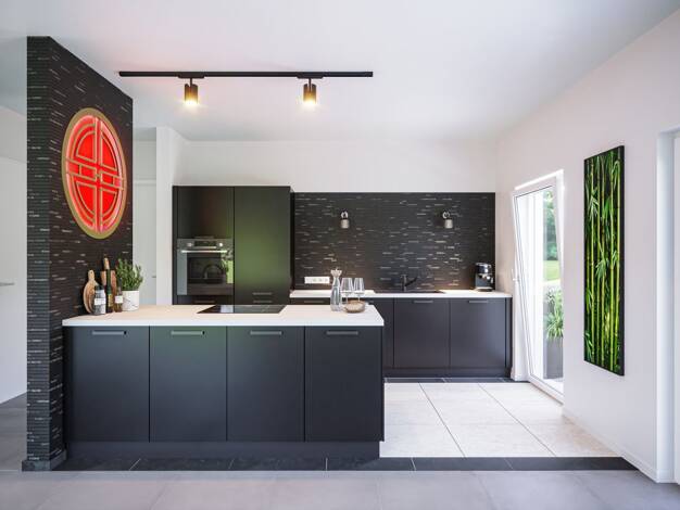 Die kubische Form ist der Klassiker im Stadthausdesign und prägt auch das Aussehen unseres Stadthaus Flair 124. Im Inneren setzt sich der urbane Stil fort: der großzügige Wohn- und Essbereich erstrec...