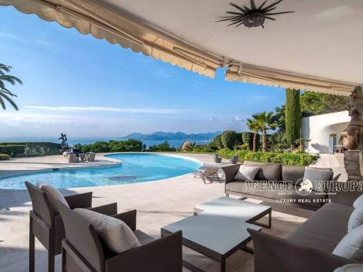 superb californian style villa located in a residential area of ??cannes with a magnificent panoramic view of the sea and the bay of cannes. quiet and residential environment a few minutes from the c...