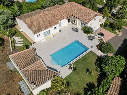Nichée au cour d'un quartier résidentiel et parfaitement au calme à 10mn de Cannes, cette propriété d'exception développe une surface habitable totale d'environ 375 m² comprenant une maison principal...