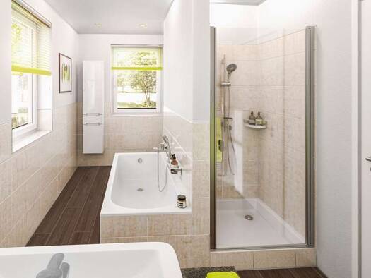 Der Name „Flair 110“ steht für 110 Quadratmeter Wohnerlebnis: Ein Blickfang sind die bodentiefen Fenster, die den Wohnbereich mit viel Licht durchfluten. Hell, gemütlich und weitläufig – genügend Rau...