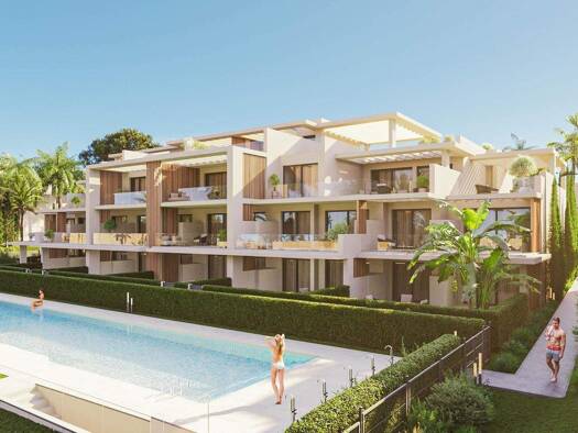 Kurzbeschreibung Die eleganten Wohnungen in Estepona Málaga befinden sich in einer Anlage im Resort-Stil, 3 km vom Meer entfernt. Die Anlage bietet Pools, Sauna, Coworking-Spaces und vieles mehr. Obj...