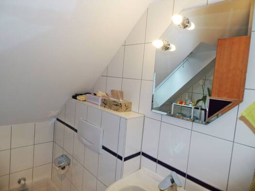 Die gutgeschnittene Eigentumswohnung erstreckt sich auf zwei Ebenen, das Dachgeschoss und der Spitzboden. Von der Diele kommen Sie in den offenen Bereich Wohn- Esszimmer und Küche mit Kochinsel und v...