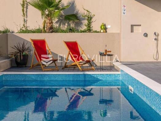 KASTEL SUCURAC, MODERNA KUCA ZA NAJAM, BAZEN I OKUCNICA Kastel Sucurac, iznajmljuje se predivna kuca u bloku u novogradnji organizirana na tri etaze ukupne stambene povrsine 250m2 s bazenom, terasom ...