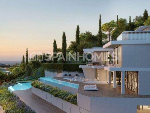 Kurzbeschreibung Gut gestaltete Villen mit Panoramablick auf das Meer und Infinity-Schwimmbad sind in einer prestigeträchtigen Lage in Benahavís, Costa del Sol. Die geschlossene Anlage hat Annehmlich...