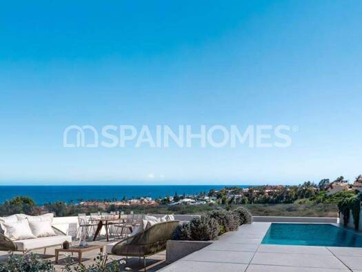 Häuser mit Meerblick, Privatpools und Gärten in einem Komplex in Málaga Die Häuser verfügen über ein modernes Design mit offenen Wohnbereichen, geschmackvollen Küchen, großen Fenstern, Klimaanlagen, ...