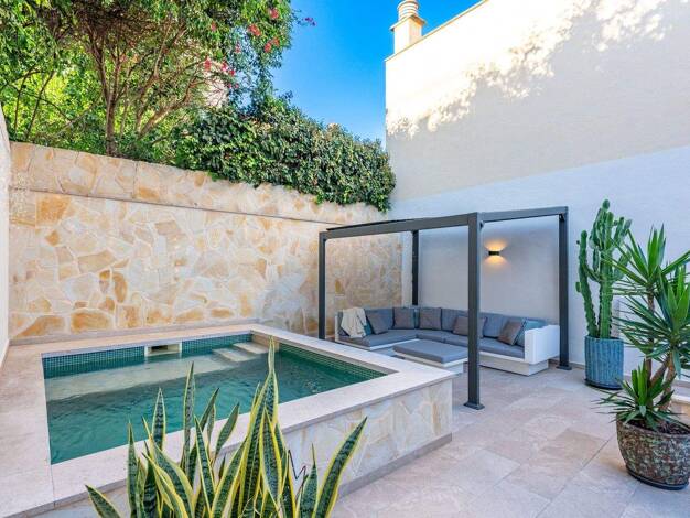 Dieses charmante, zweigeschossige Stadthaus mit hoher Privatsphäre liegt in einer ruhigen Straße des begehrten Viertels El Terreno in Palma. Im Eingangsbereich befinden sich die Garage, ein Gästeschl...
