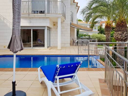 An excellent house for a large family is located 90 meters (2 minutes walk) from the beautiful secluded Cala Trons beach in the prestigious urbanization of La Montgoda, 5 minutes by car to the center...